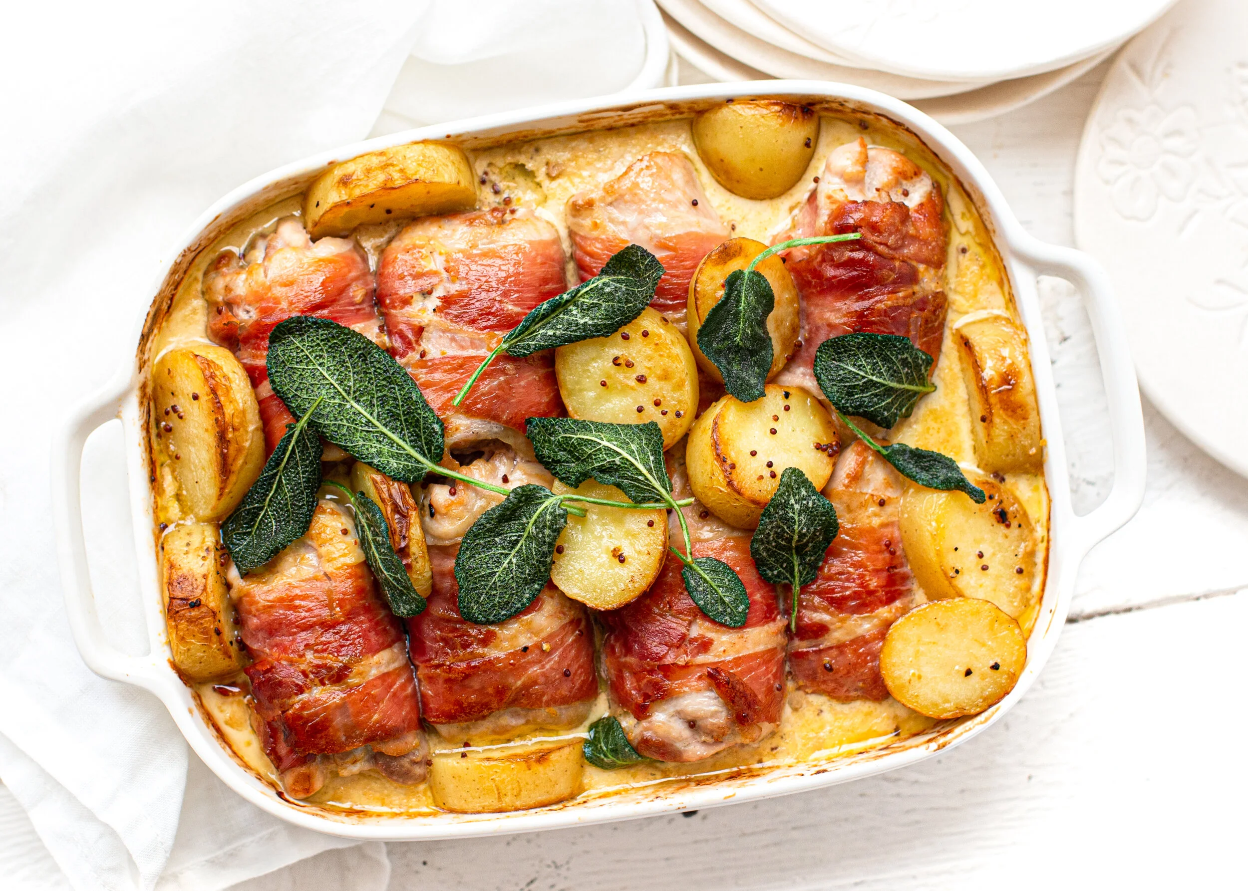 Baked Chicken Thighs with Prosciutto, Potato & Wholegrain Mustard Sauce